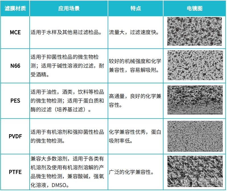 《中邦药典》和GB4789系列尺度均划定微生物检测滤膜孔径不大于0.45μm。过大的孔径存正在被微生物穿透的危急,而过小的孔径则会消重过滤的恶果。对待检测微生物穿透的题目,我司过程尝试证明纵然小如寻事除菌过滤器的缺陷短波单胞菌,行使0.45μm滤膜过滤后作育其接收率也正在80%以上,和举措合用性的其他微生物没有显明分别,以是微生物检测并不必要行使更小孔径的滤膜,0.45μm的滤膜便是拔取。02 滤膜材质拔取常睹的微孔滤膜材质包罗搀杂纤维素(MCE)、尼龙(N66)、聚醚砜(PES)、聚偏二氟乙烯(PVDF)和聚四氟乙烯(PTFE)等。